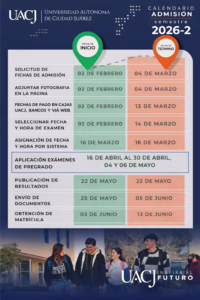 Ciudad Juárez, Chih.- La Dirección General de Servicios Académicos de la Universidad Autónoma de Ciudad Juárez (UACJ) publicó el calendario oficial para el proceso de admisión correspondiente al semestre 2026-2, que abarca de agosto a diciembre de 2026.