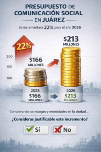 Ciudad Juárez, Chihuahua. – El Cabildo municipal aprobó el Presupuesto de Egresos 2026 por 10 mil 797 millones de pesos, un monto histórico. Sin embargo, el incremento en el rubro de Comunicación Social ha generado controversia entre sectores ciudadanos.El Regidor 19 en su cuenta de redes, lanzó esta gráfica.