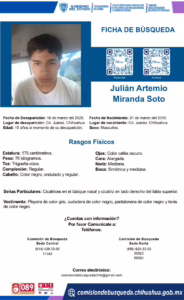 Ciudad Juárez, Chih.- La Comisión Local de Búsqueda de Chihuahua emitió una ficha para localizar a Julián Artemio Miranda Soto, de 15 años de edad, quien fue visto por última vez el pasado 16 de marzo de 2026 en esta localidad.